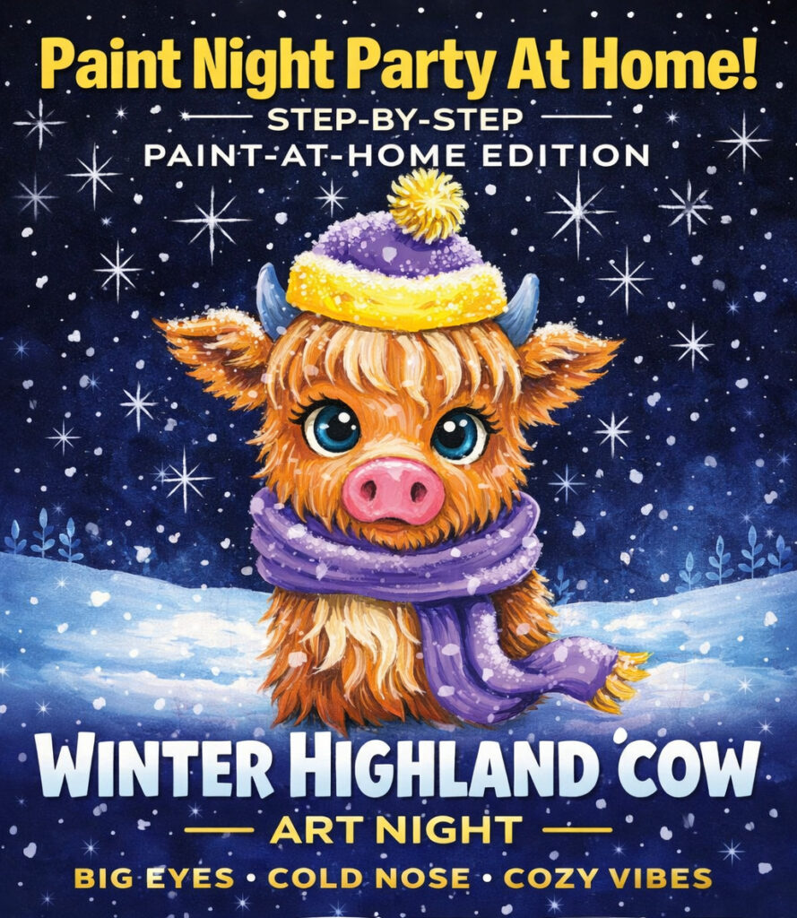Paint the Town at home! Paint the Winter Highland Cow at home, and even make it a party!